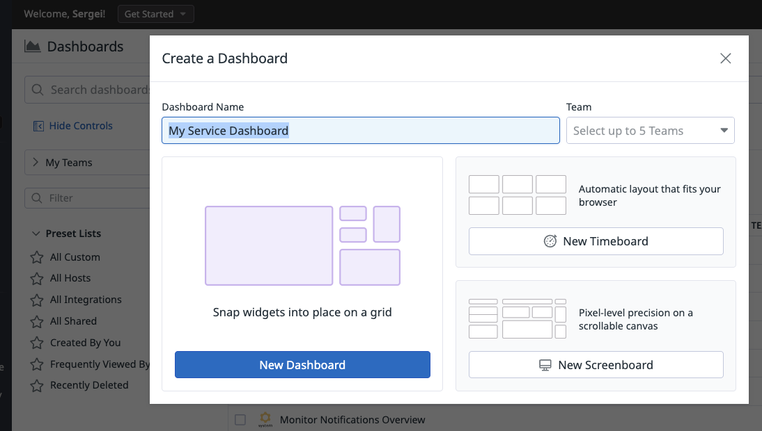 1. Click Import dashboard JSON and drag and drop monitoring/datadog-dashboard.json file
